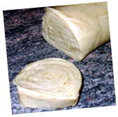 まずは薄く大きくのばしたパイ生地を 長い棒状に巻き、1センチほどの厚さの輪切りにします。ちょうどお寿司の太巻きのような大きさです。